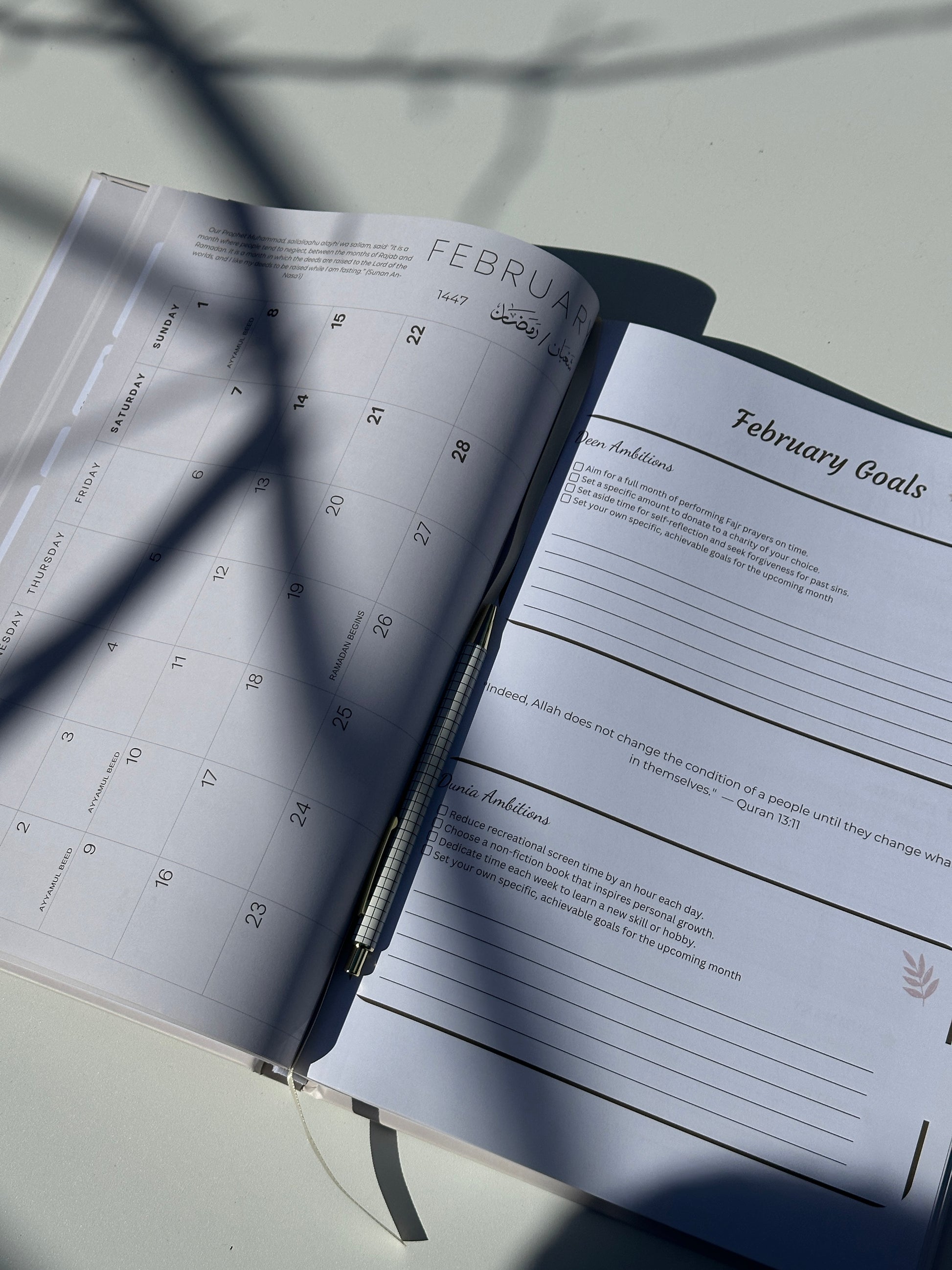 The Deen and Dunia Planner is a beautifully designed daily planner created to help you live intentionally, balancing your deen (faith) and dunia (worldly life). Every page is crafted to support spiritual reflection, personal growth and effective planning — all in one thoughtful package.
